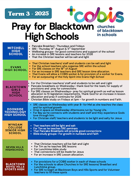 The Churches Of Blacktown In Schools Inc. (COBIS) is a not-for-profit fundraising organisation that places Christian workers in Blacktown City public high schools.